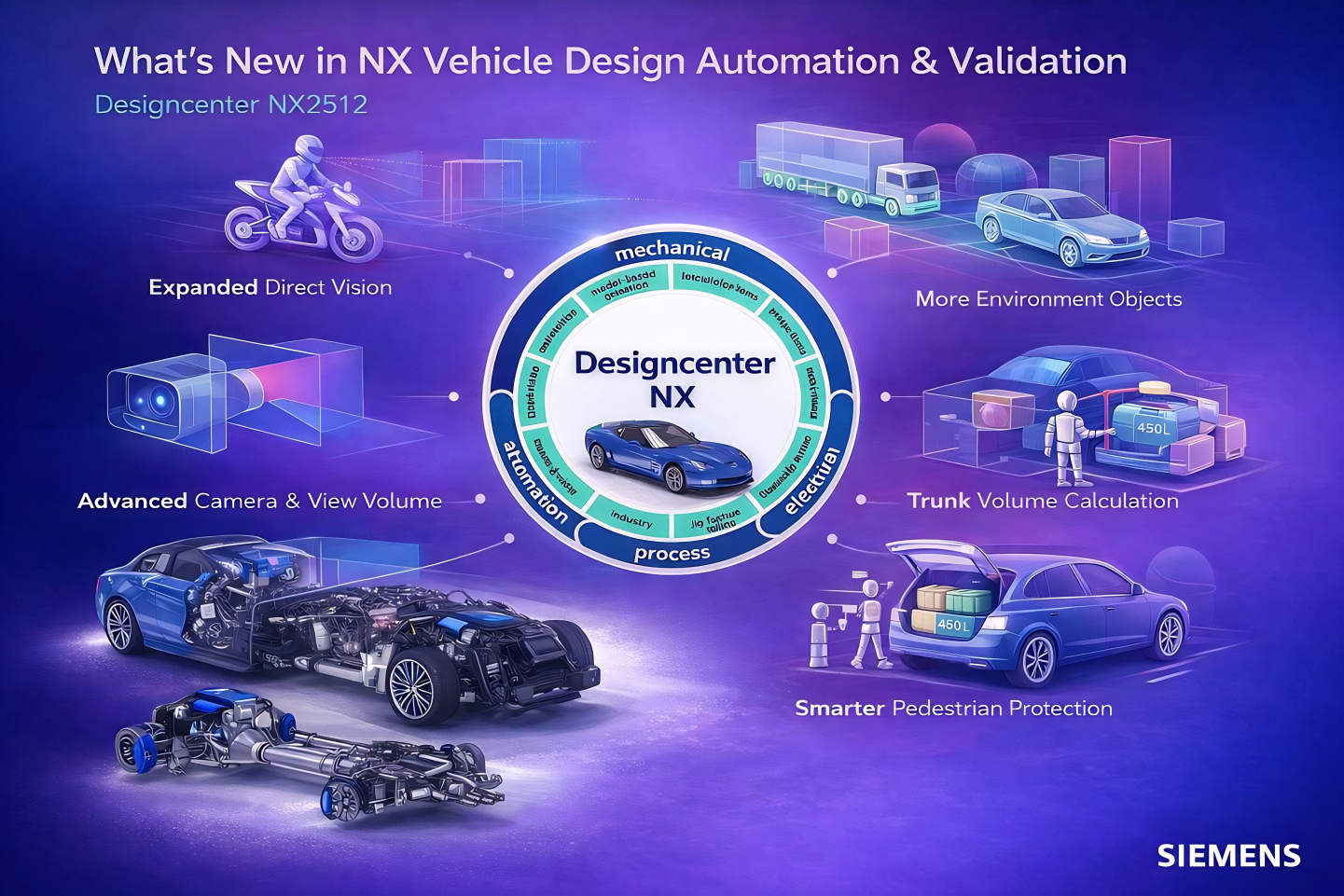 Designcenter NX 2512 tiếp tục khẳng định vai trò trung tâm của NX trong chiến lược Digital Twin toàn diện của Siemens, đặc biệt trong lĩnh vực thiết kế – tự động hóa – xác nhận thiết kế phương tiện (Vehicle Design). Phiên bản mới mang đến hàng loạt cải tiến quan trọng cho cả Vehicle Design Automation (VDA) và Vehicle Design Validation (VDV), giúp doanh nghiệp rút ngắn thời gian phát triển sản phẩm, tuân thủ tiêu chuẩn quốc tế và nâng cao mức độ an toàn ngay từ giai đoạn thiết kế sớm.