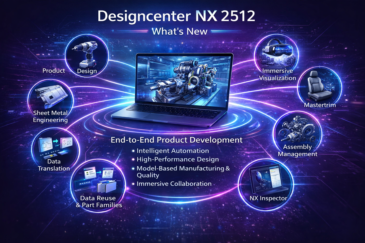 Designcenter NX 2512 đánh dấu một bước tiến quan trọng trong thiết kế sản phẩm, thiết kế kim loại tấm, quản lý lắp ráp, cũng như các giải pháp Join, Data Translation, Immersive Visualization, Mastertrim, NX Inspector và Data Reuse & Part Families được tăng cường. Phiên bản này mang đến một giải pháp end-to-end thực sự, hỗ trợ doanh nghiệp: