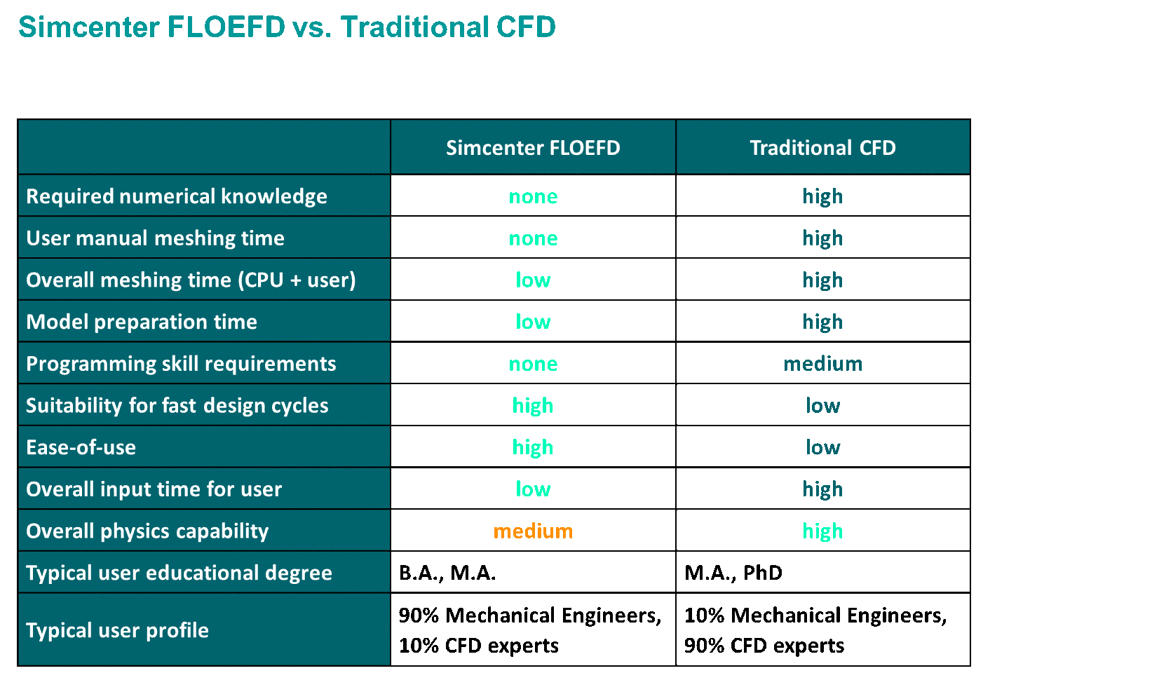 Không giống như các phần mềm CFD thông thường chỉ tập trung vào kỹ sư phân tích (analyst), Simcenter FloEFD được thiết kế đặc biệt cho kỹ sư thiết kế CAD – những người cần đưa ra quyết định kỹ thuật nhanh và chính xác trong giai đoạn phát triển sản phẩm ban đầu.