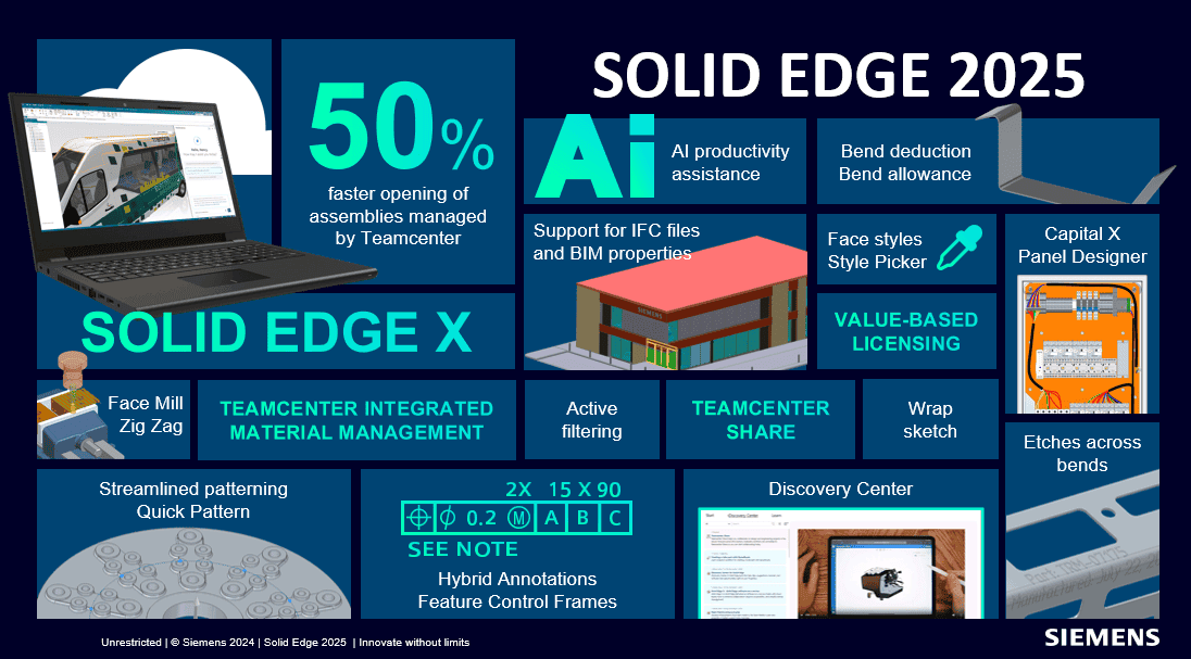 Solid Edge là lựa chọn tối ưu cho các doanh nghiệp sản xuất, đặc biệt là doanh nghiệp vừa và nhỏ, nhờ khả năng tích hợp CAD – CAM – CAE – PDM toàn diện, chi phí phù hợp và công nghệ tiên tiến của Siemens. Với sự phát triển của Solid Edge X, giờ đây bạn có thể tiếp cận thiết kế kỹ thuật cơ khí mọi lúc mọi nơi – tương lai của CAD nằm trong tầm tay bạn.