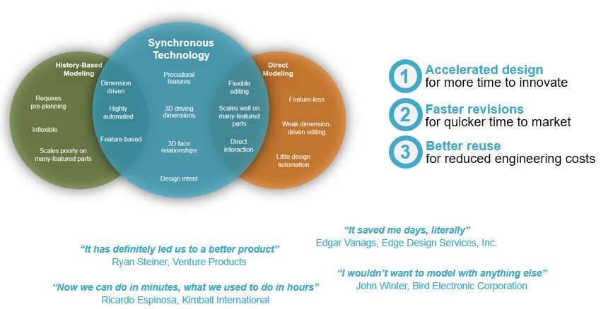 Với công nghệ synchronous (mô hình hóa đồng bộ) độc quyền, phần mềm Solid Edge giúp kỹ sư thiết kế nhanh hơn, chính xác hơn và dễ dàng chỉnh sửa mô hình mà không bị giới hạn như các phần mềm CAD truyền thống