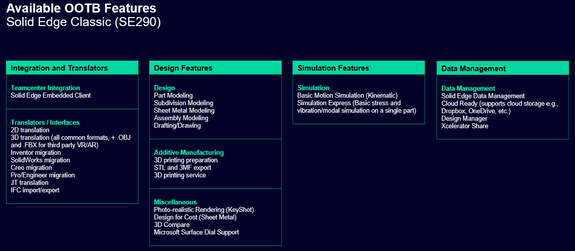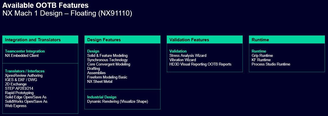 Tất cả chức năng add-on NX CAD (Design), NX CAM (Manufacturing), Solid Edge, Simcenter 3D (for Simulation):